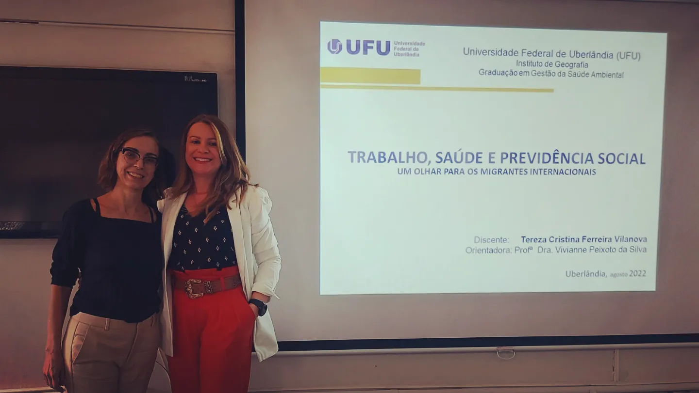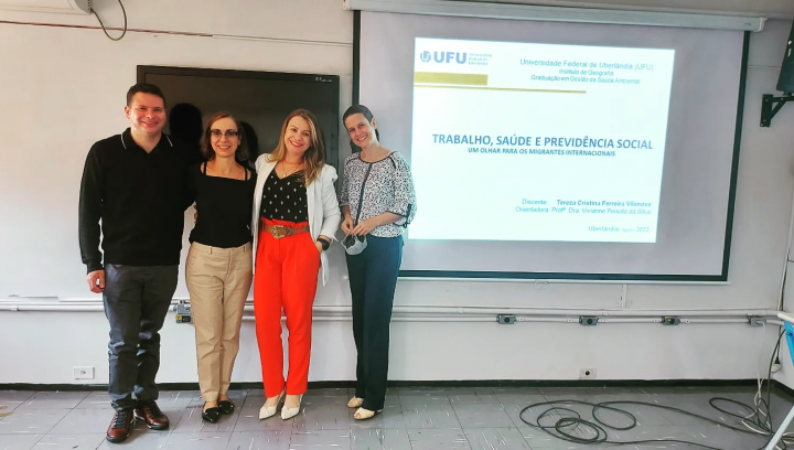 A pesquisa intitulada "Trabalho, Saúde e Previdência Social - um olhar para Migrantes Internacionais " foi defendido pela aluna Tereza Cristina Ferreira Vilanova matriculada no currículo versão Gestão em Saúde Ambiental e, orientada pela Profa. Dra. Vivianne Peixoto da Silva. A banca avaliadora foi composta pela Profa. Dra. Marrielle Maia do curso de Relações Internacionais e Coordenadora da Cátedra Sérgio Vieira de Mello da UFU e, o Técnico Administrativo Mestre Dênis Sebastião Ramos Firmino.