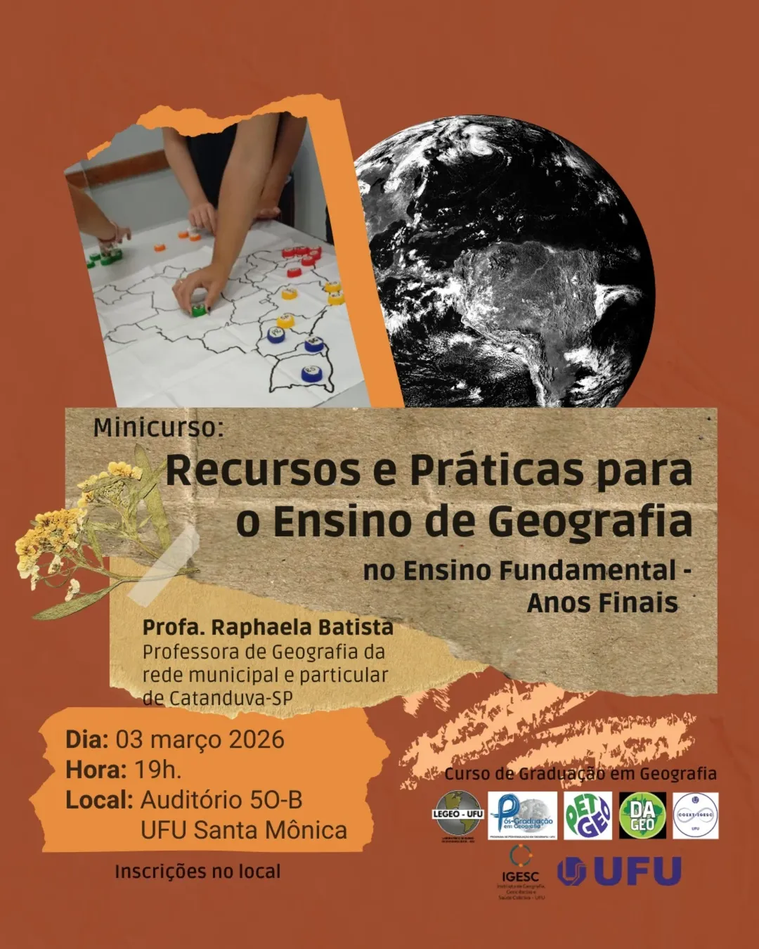 A ação consiste em um minicurso com apresentação e orientações para o uso de recursos e procedimentos didáticos para o ensino de Geografia no Ensino Fundamental (Anos Finais). Será ministrado por uma professora de Geografia da rede municipal de ensino de Catanduva-SP, que atua há sete anos na docência com alta qualidade profissional. O minicurso será realizado dia 03/03/2026, às 19h., no Auditório 5O-B e terá a duração de 3h30min. e destinada a estudantes de graduação e pós-graduação em Geografia, professores de Geografia da rede municipal e demais interessados. A atividade será promovida pelo LEGEO e Coordenação de Curso de Geografia, em parceria com o Programa de Pós-Graduação em Geografia, o PET-Geografia e o DAGEO, com discentes e docentes participantes na equipe de organização, como a professora propositora, a coordenadora do Curso de Geografia, alunos da graduação e da pós-graduação em Geografia.